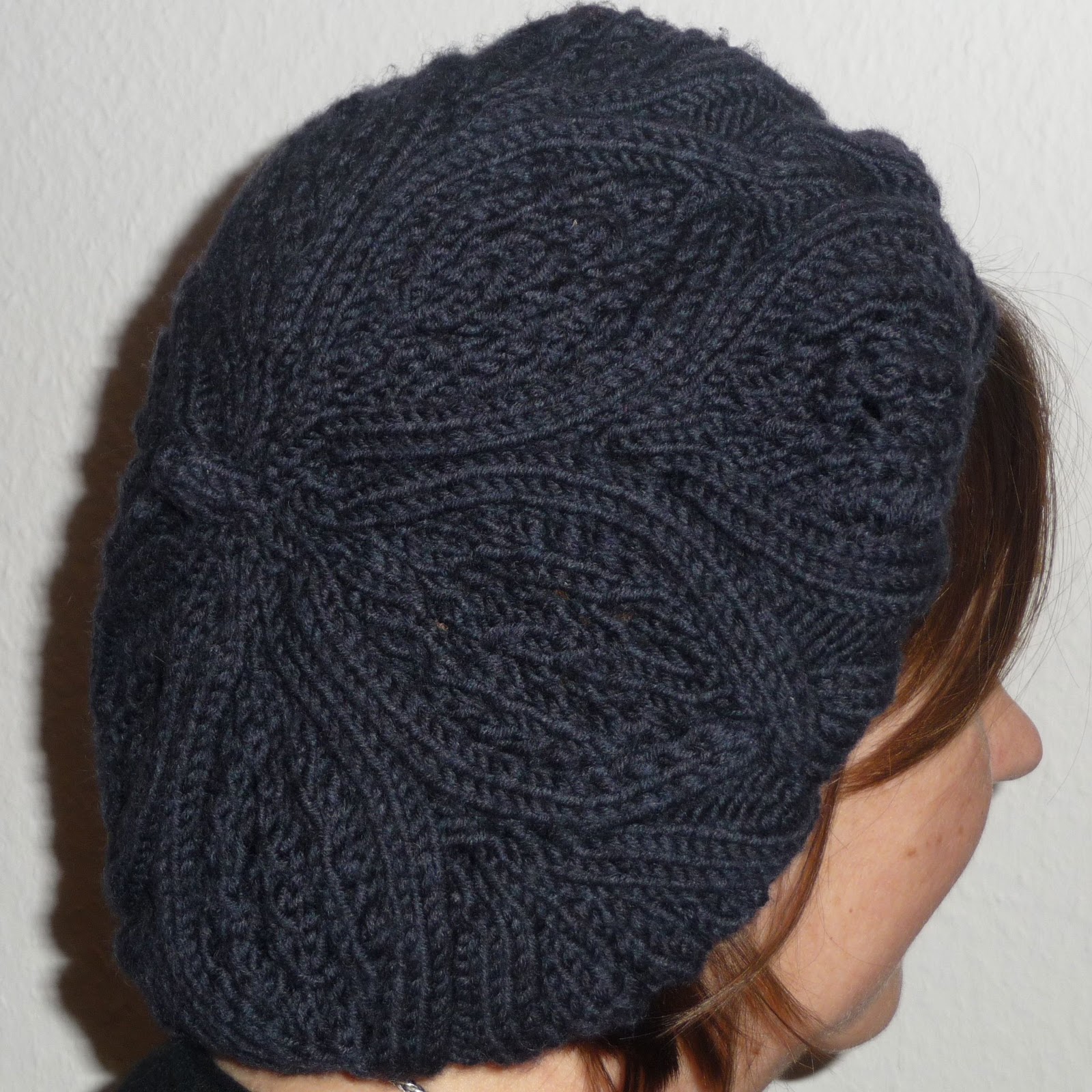 Dieses Barett besteht aus schwarzer Merinowolle. Das Muster ist im Internet zu finden: