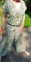 Unklar war zu Beginn des Nähprozesses wie lang die Hosenbeine werden sollen. Ich habe sie also als lange Hosen zugeschnitten. Dadurch wurde der Originalstoff so knapp, dass ich einen hellgrünen einfarbigen Stoff für die Belege und die inneren Taschen benützt habe. Belege am Hals und an der Knopfleiste sind doppelt mit dünner Vlieseline verstärkt. Wichtig war, dass die Druckknöpfe sich nicht nach außen durchdrücken, also vollständig unsichtbar bleiben. Durch die doppelte Verstärkung ist das gelungen. Auf das Einsetzen eines Gummibandes in der Taille wurde verzichtet. Als kleine Spielerei habe ich Gürtelschlaufen aufgesetzt und im Rücken verkreuzt.