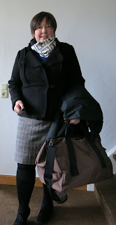 Für die Autoreise trage ich den Rock, einen blauen, noch nicht beschriebenen Pulli nach dem Burdaschnitt  und die schwarze Walkjacke aus den Projekt. Noch nicht beschrieben ist auch der Loop aus Stoffresten.