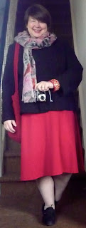 Heute ist rot mit dunke schwer angesagt beim MMM. Auch Deine Kombi gefällt mir ausgesprochen gut, Starke Farben! Auch mit dem lila. Ich finde die Kombi mit der Walkjacke besonders toll, weil mehr von dem Kleid zu sehen ist 😉 LG Kuestensocke