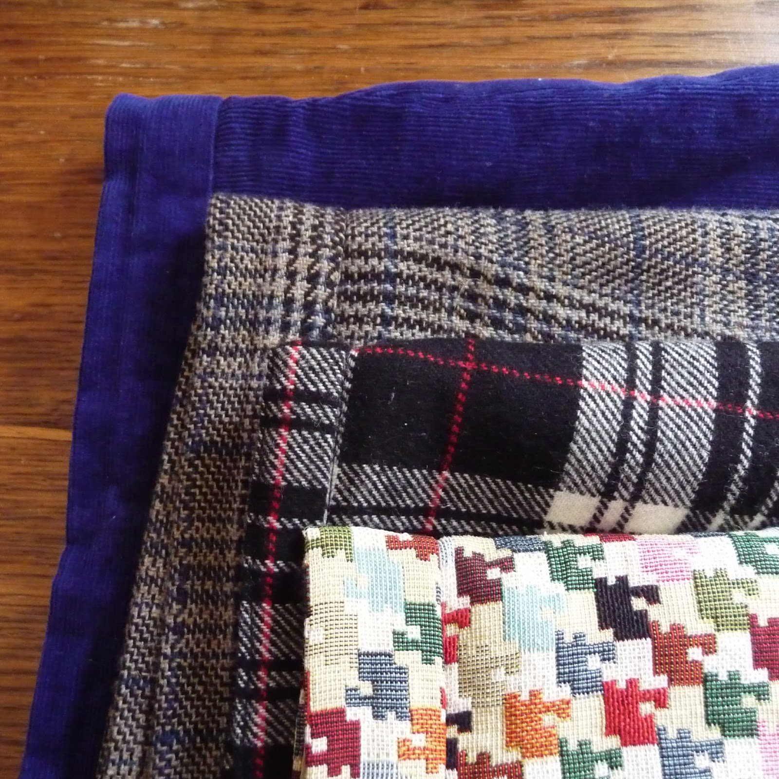 Inzwischen habe ich mit ganz verschiedenen Stoffen gearbeitet. In diesem Bild links sieht man die Stoffe der Röcke gut. Die beiden obersten Röcke sind aus Cordstoff. Der blaue Rock besteht aus feinem Babycord. Der Stoff des hellbeigen Rockes ist etwas elastisch. Der dunkle Rock darunter ist aus einem festeren Wollstoff genäht; ähnlich einem alten Anzugstoff. Darüber liegen zwei Röcke aus Dekorationsstoff. Der untere sollte ein Gardinenstoff aus Baumwolle sein,  der Stoff darüber ist ein Jacquardstoff und wurde als Möbelstoff verkauft. Die beiden letzten Röcke bestehen aus Wollstoff. Einer ist beige mit blauen dünnen Streifen und der schwarz weiße Rock hat dünne rote Streifen.