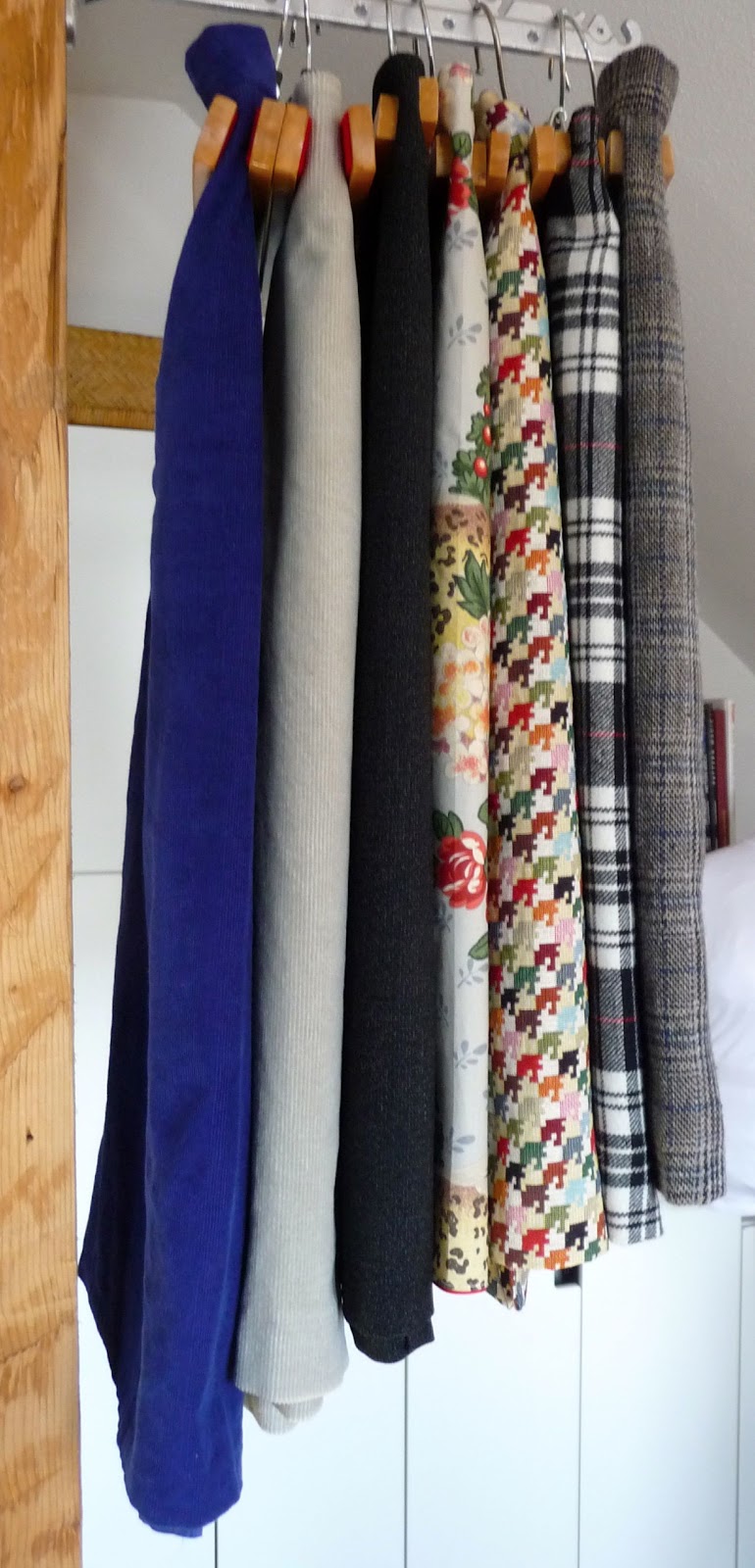 Rockaufhänger brauche ich auch nicht. Bei gekauften Röcken stehe ich damit auf Kriegsfuß. Sie hängen raus wenn ich nicht aufpasse, sie sind oft zu groß oder zu klein. Darüber hinaus benütze ich zum Aufhängen Klappbügel.