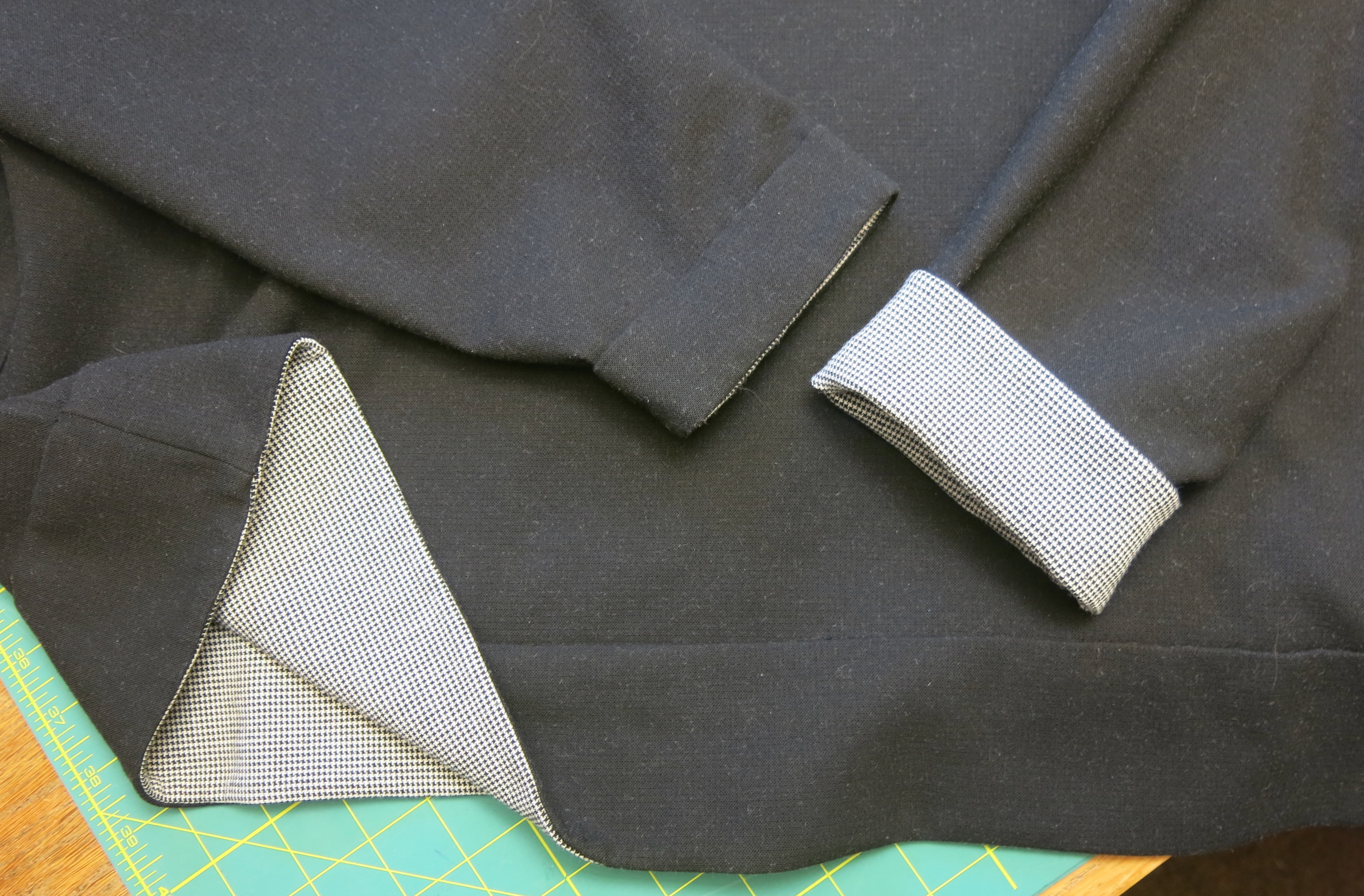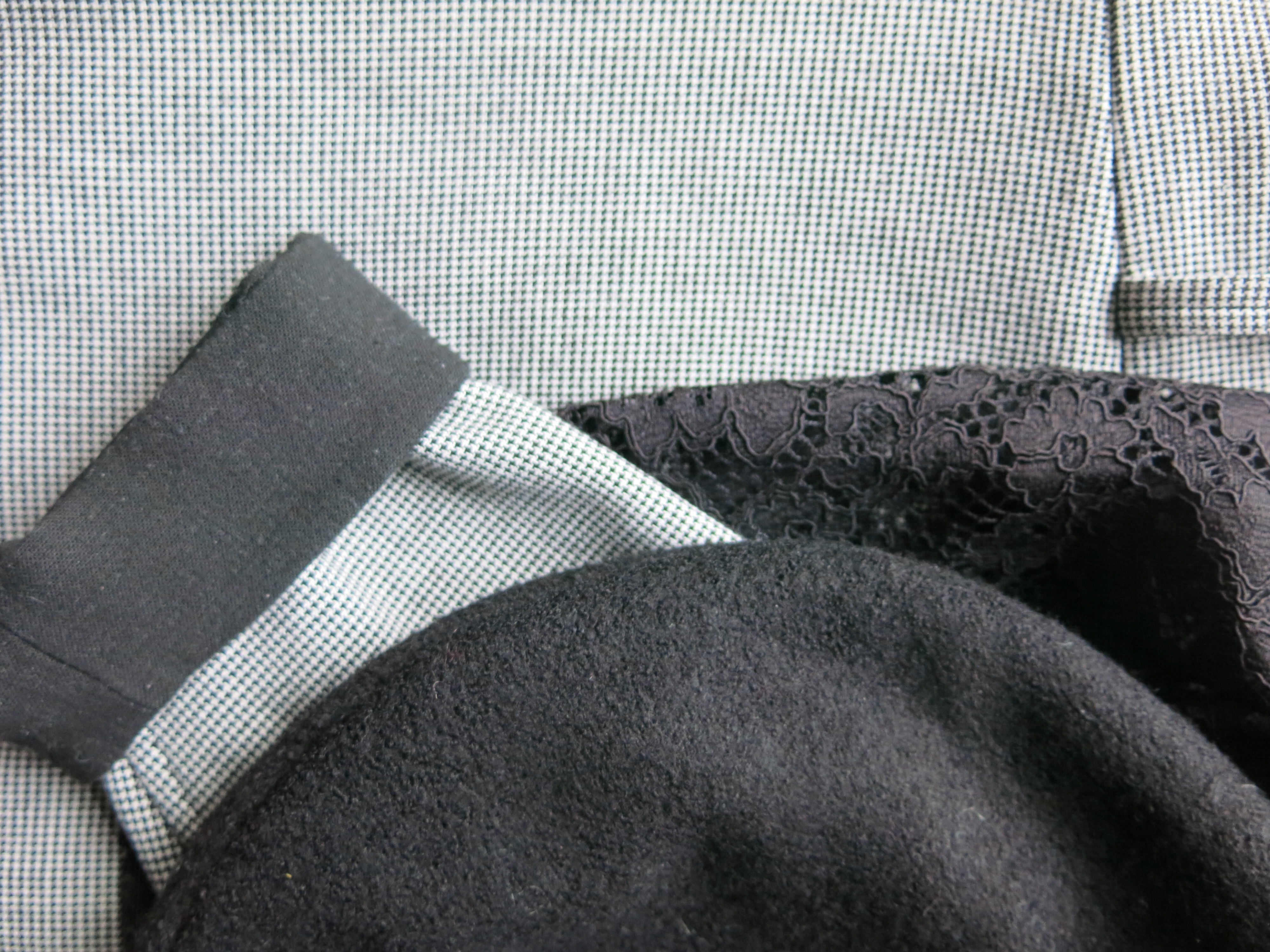 Den Rollkragen ist gedoppelt und dazu habe icch eine Hälfte in schwarz und die andere Hälfte in pepita zusammengenäht. Der Umschlag ist von hand anstaffiert. Ich wollte keine sichbare Näht haben.