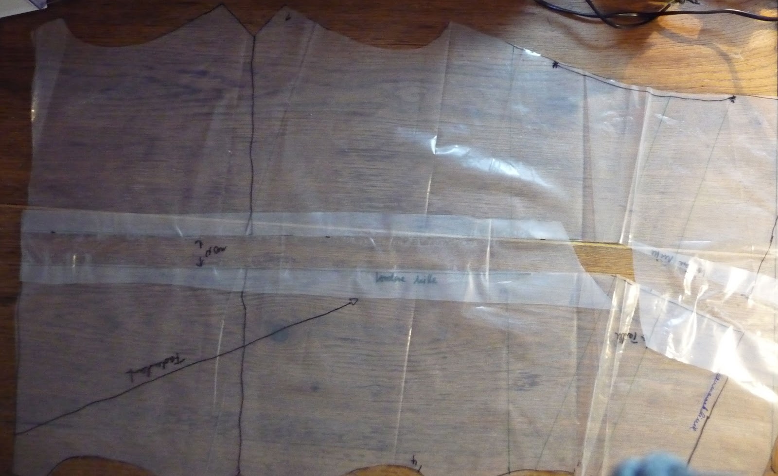 Dann habe ich den Folienschnitt an der vorderen Mitte aufgeschnitten und 4 cm erweitert. Dazu wurden zwei Folienstreifen mit Klebefolie eingefügt. Einer ging vom Halsausschnitt bis zur Seitenfaltung der andere vom unteren Saum bis zur Seitenfaltung.