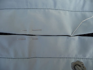 Futter und Oberstoff werden mit der Nähmaschine und mit breitem Abstand zu den endgültigen Nähten miteinander verquiltet.