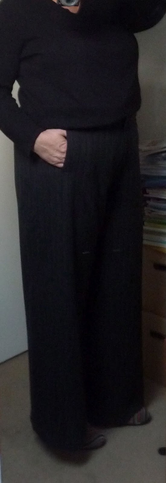 Der Prototyp für so eine weite Hose ist jetzt fertiggestellt. Es gibt dafür ein angepasstes Schnittmuster. Natürlich weiss ich, dass bei jedem Stoff feine Veränderungen nötig sind aber immerhin, die erste Hose ist fertig. Ich habe sie aus einem alten dickeren Wollstoff genäht der sicher schon 10 Jahre in meinem Schrank gelegen hat.