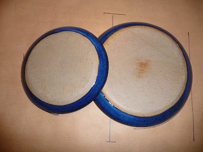 Auf Packpapier habe ich diese Maße auf einem Kreuz abgetragen und mit Hilfe von zwei Tellern und dem Kurvenlineal ein eiförmiges Oval gezeichnet. Dabei ist das Ei doch schmaler geworden.