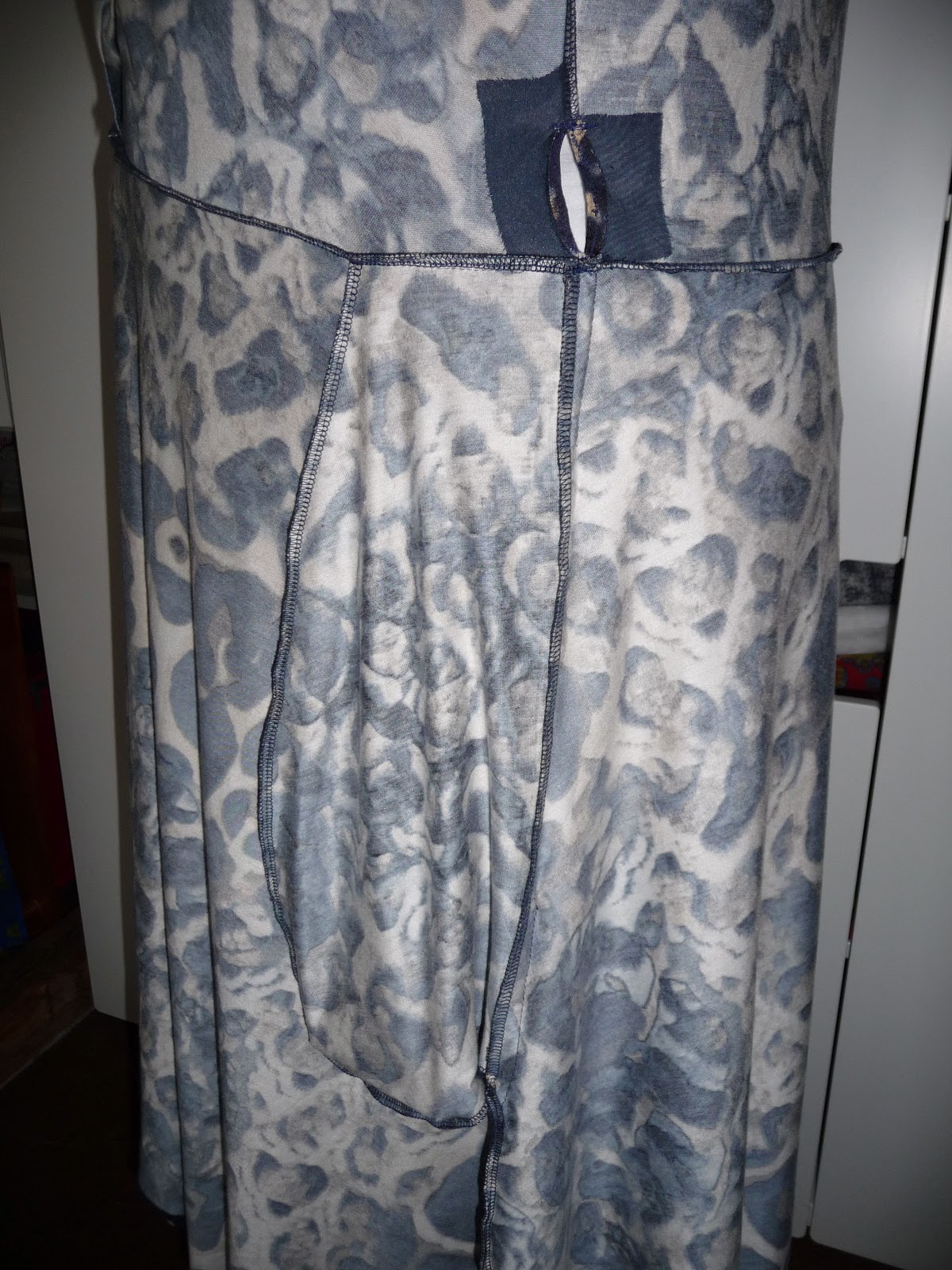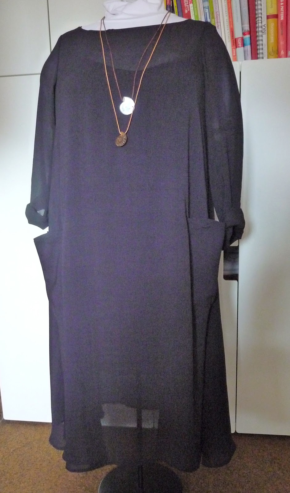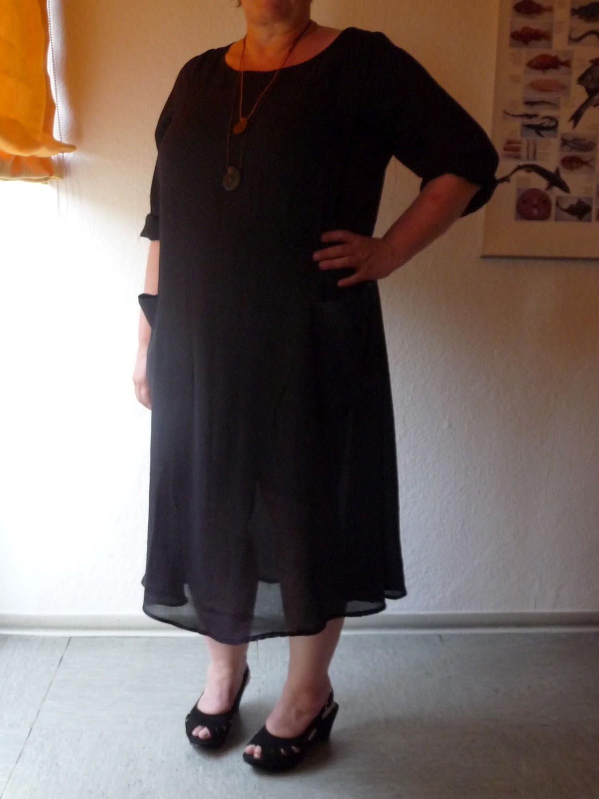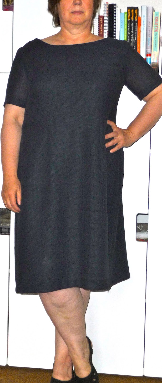 Das Kleid hat einen lockeres, den Körper umspielenden Schnitt und wird nur durch die kurvigen Seitennähte in Form gebracht. Es hat keine Abnäher. Im Rocksaum sind an vier Stellen kleine Falten eingeplant. Die habe ich nicht realisiert. Die Ärmel sitzen sehr hoch auf den Schultern und es gibt zwei große aufgesetzte Taschen.