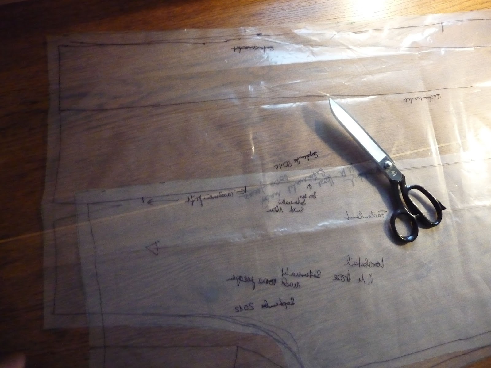 Jetzt hatte ich eine Hose mit der gewünschten Taillenlösung die gut sitzt. Der nächste Schritt war die Vorverlegung der Seitennaht. Dazu habe ich das Schnittmuster erneut auf Folie kopiert und das hintere Hosenteil an der äußeren Seitennaht um 10 cm verbreitert. Das vordere Hosenteil wurde an der Seitennaht um diese 10 cm schmaler gezeichnet. Um die Hüftkurve habe ich mich zunächst nicht gekümmert. Hüfte und Taille haben bei mir keine riesigen Unterschiede und den Fehlbetrag der Hüftkurve habe ich  beim ersten Anpassen der Hose in zwei Abnähern untergebracht. Dieser Schritt ist nicht dokumentiert.