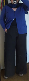 Der Stoff ist ganz zarte durchsichtige karierte Viskose in zwei dunklen Blautönen. Gekauft habe ich einen ganzen Ballen in einem Resteladen für 1€ den Meter.