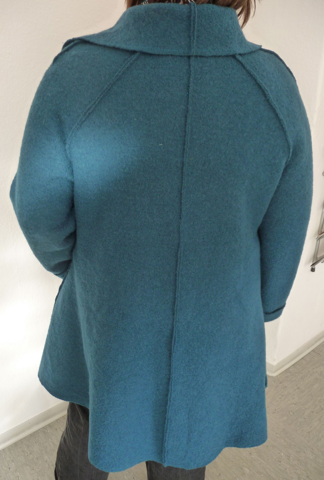 Mit diesem Schnittmuster wurden vier Schichten Stoff ausgeschnitten. Als Aussenhülle dient auf der einen Seite ein blauer Wollstoff und auf der anderen Nessel. Die innerer Schicht besteht zwei Lagen weicher Baumwolle (hier ein altes Bieberbettlaken) .