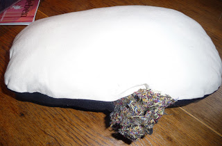 Nach dem Wenden des Eis durch das Loch konnte zwischen die beiden Bieberbetttuchschichten die Füllung gestopft werden. Ich habe lauter kleine Stoffreste genommen. Je kleiner desto besser. Zu große Stücke drücken sich nach außen durch. Besonders bewährt haben sich die Reste von der Overlockmaschine. Bei meinem Ei ist das Loch zur Zeit noch nicht zugenäht sondern mit einer Sicherheitsnadel gesichert. So kann ich das Ei schon benutzen, obwohl es noch nicht fertig ist. Denn das Innere kann immer noch fester gestopft werden und alle aktuellen Reste aus der Overlockmaschine verschwinden im Moment im Bügelei. Es ist unglaublich, wie viel Zeugs in dem Ding verschwinden kann.