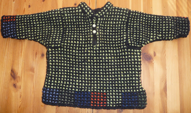 Ich möchte noch mal an das wunderbare Kinderstrickbuch* erinnern aus dem ich das Muster habe. Daraus werde ich sicher noch mehr stricken. Die dickere Wolle (Royal Tweed, Lana Grossa, 50g/100m) erforderte einige Anpassungen und ich habe noch zwei Erbsen als Knöpfe am Halsausschnitt hinzugefügt.