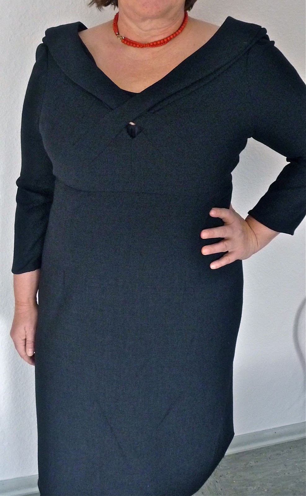 Am Ausschnitt vorne, da wo die Kragen sich kreuzen, entsteht ein Loch. Dies soll mit einem Stoffstück innen verdeckt werden. Das habe ich mir geschenkt. Das Loch ist geblieben.