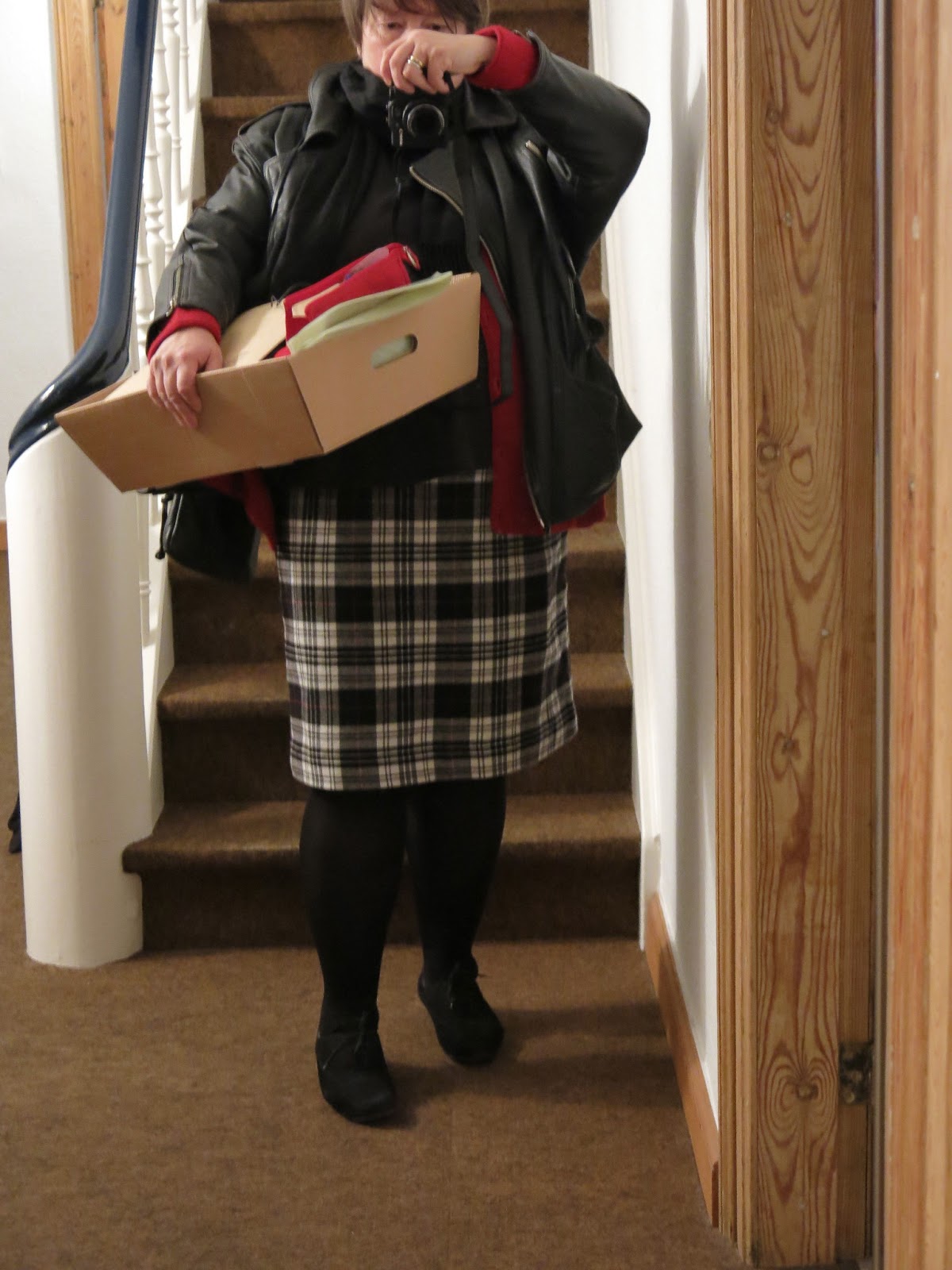 Wenn ich schon an der roten Jacke nähe, dann ziehe ich auch die schon fertigen passenden Kleidungsstücke an: Der karierte Rock und das Peplumtop. Ich habe übrigens ein neues aus Romanitjersey genäht um die Bequemlichkeit zu erhöhen. Die gekaufte rote Strickjacke und meine alte Lederjacke ergänzen das Qutfit. Es regnet und regnet, da werde ich wohl auch noch einen Hut aufsetzen.